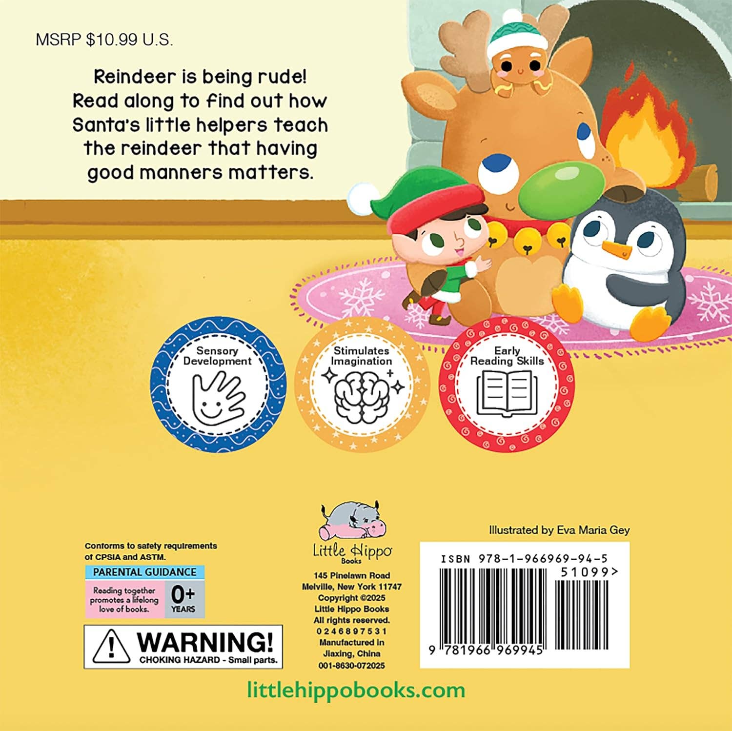 Reindeer is being rude! Read along to find out how Santa's little helpers teach the reindeer that having good manners matters. Children can learn about manners and treating others nicely while exploring various sensory touch-and-feel elements.